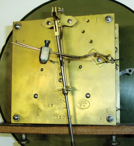 the case has had its old finish removed and now could use some polish or varnish, but it is complete and in very good condition. The lacquered brass bezel and pendulum bob are bright. The movement number is "one million" plus 913007. The metallic dial is clean with just minor flaking of the black numbers. On the lower door, above and below the beveled glasses, are age splits. It strikes with two hammers on two coiled gongs. Ht 30 1/2"