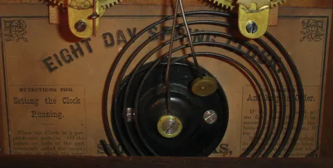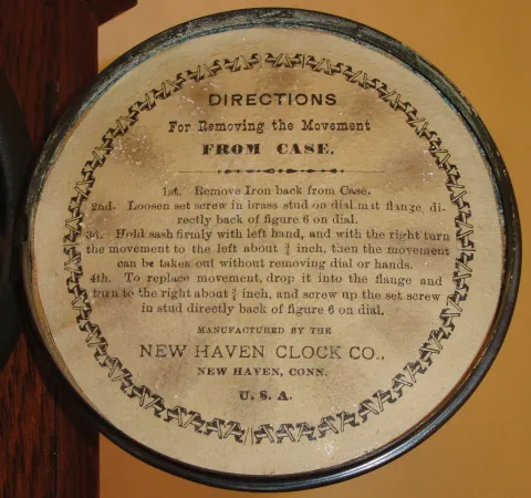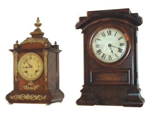 Clocks- 2 (Two) Connecticut Shelf: (1) New Haven Clock Co., New Haven, Conn., "Lurine" model spring driven 15 day time and strike (hour and half hour on cathedral gong) in oak case, c1889. (2) Seth Thomas Clock Co., Thomaston, Conn., "Arch Top" model