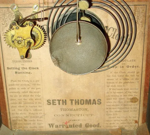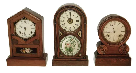 Clocks- 3 (Three) Connecticut shelf: (1) E. Ingraham & Co., Bristol "Grecian" 8 days, time and strike,,; c1870. (2) Jerome & Co., New Haven, 8 days, time and strike, c1880. (3) Seth Thomas Clock Co., Thomaston, "Chicago" 8 day time, strike & alarm, c1880.