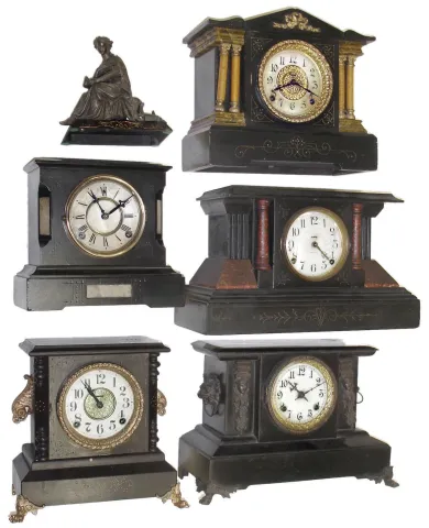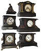Clocks- 5 (Five) Black Mantel Connecticut 8 days, time and strike,, plus one figural top ornament: three Ingraham wood; New Haven iron; unsigned in stone case; late 19th century