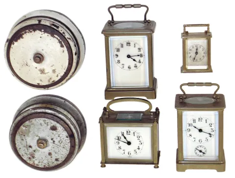all three French carriage clocks have newer replacement platforms that appear to tick, their beveled glasses are good, and two of the porcelain dials ...