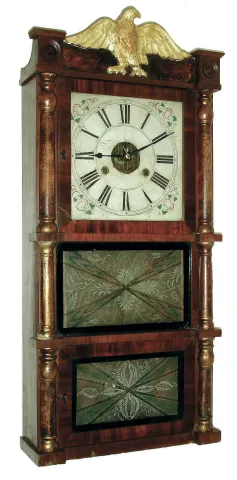 Mahogany veneered case with old finish and small veneer loss on the base. Eagle splat has been repaired and regilded. Original painted dial has some minor paint loss and wear. Original gilt and grained columns with some wear under a dark finish. Hands are original. Both tablets are original with the bottom tablet broken in the lower right corner. This clock may possibly have had turned feet originally. Ht 35"