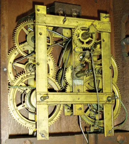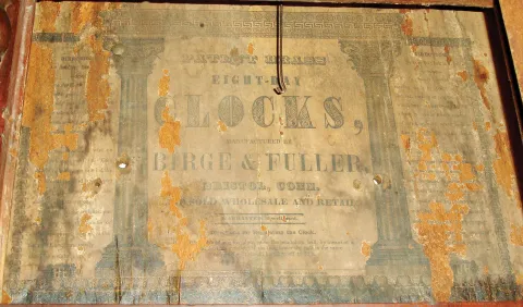 Birge & Fuller, Bristol, Conn., 8 days, time and strike, weight strap brass movement triple decker shelf clock with faux tortoise shell and gilt columns and gilt eagle splat, c1845 Mahogany veneered case with old finish and small veneer loss on the base. Eagle splat has been repaired and regilded. Original painted dial has some minor paint loss and wear. Original gilt and grained columns with some wear under a dark finish. Hands are original. Both tablets are original with the bottom tablet broken in the lower right corner. This clock may possibly have had turned feet originally. Ht 35"