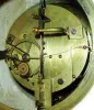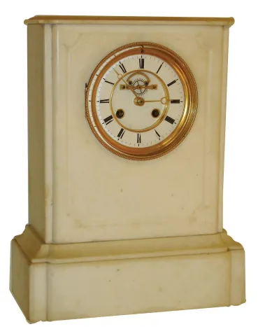 French alabaster 8 days, time and strike, mantel clock, visible escapement, c1890 except for very minor edge chips and faint discoloration, the case is in very nice condition. The porcelain dial, with its steel-pallet escapement, has a faint hairline, and the beveled glass is fine. The unsigned movement strikes with a count wheel and bell. Ht 15"