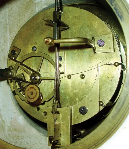 except for very minor edge chips and faint discoloration, the case is in very nice condition. The porcelain dial, with its steel-pallet escapement, has a faint hairline, and the beveled glass is fine. The unsigned movement strikes with a count wheel and bell. Ht 15"