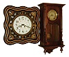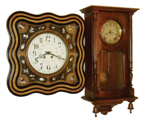 both cases are in good condition with minor flaws. The bakery clock has a nice painted metal dial with 24-hour markers. The walnut wall clock, with "Th. Brunet, Martigne Ferchaud" (retailer) on its metal dial, has a complete Morbier movement, but the pendulum may be from a German clock. Hts. 27" and 19". Sold as is, no further details available