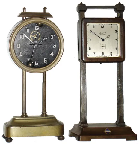 Clocks- 2 (Two) metal gravity case 30 hour novelty clocks: Ansonia with "D.J.J. Co." applied plate; French brass; early 20th century