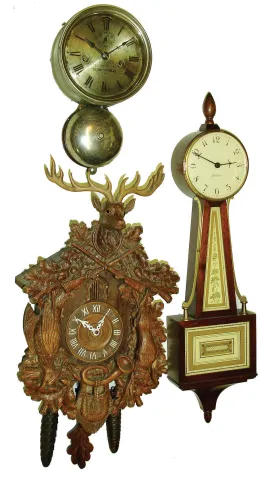 all three are in good overall condition with no major damage or losses. The marine clock has worn rear label and tarnished dial. The cuckoo has a new ...