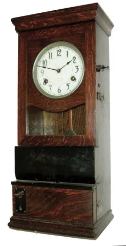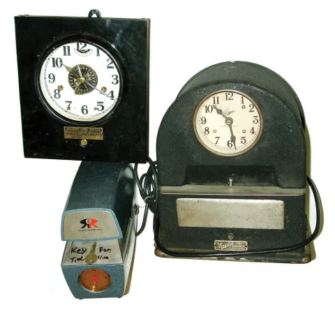 Clocks- 4 (Four) Industrial Clocks: International time clock with twin spring driven movement in large heavy oak case; Rapid print time clock metal-case plug-in electric; Simplex time clock round top metal case plug-in electric; Reliance Time Switch twin