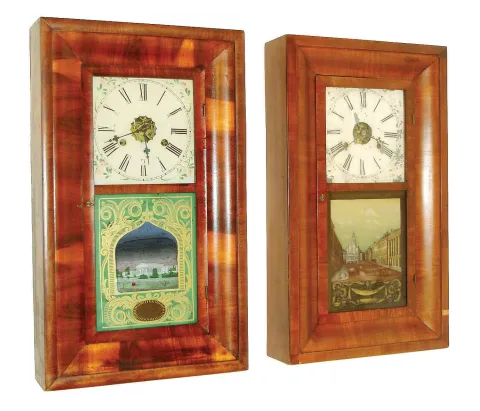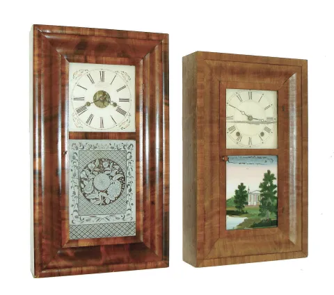 Clocks- 4 (Four) American OG/OOG shelf clocks: (1) New Haven Clock Co., New Haven, Conn., 30 hours, time and strike, OG clock. (2) New Haven Clock Co., New Haven, Conn., 30 hours, time and strike, OG clock. (3) Elisha Hotchkiss, Burlington, Conn., 30 hour