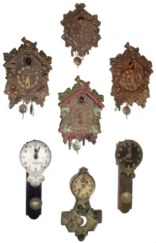 The lot consists of 4 cuckoo style novelty timepieces with composite fronts - three of them with rust on the metal movement cover. Two are small metal faced timepieces with printed on the dial: "Uncle Sam's Little Wonder" with one having a broken pendulum wire. The last is a pressed metal front with a scene printed on it. All need cleaning and service.