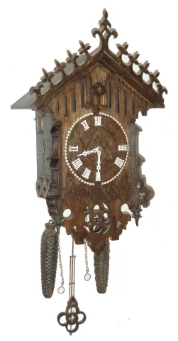 Black Forest, Germany 30 hours, walnut cuckoo weight driven wall clock with wood-plate movement, c1880 the intricate carved case appears complete but some pieces are detached. The white numerals are newer plastic, the weights do not match, and the bellows have been renewed. Note the Star of David motif on the dial and cuckoo door. The cuckoo bobs and sings, and the clock ticks, but not tested long term. Ht 18.5 without pendulum