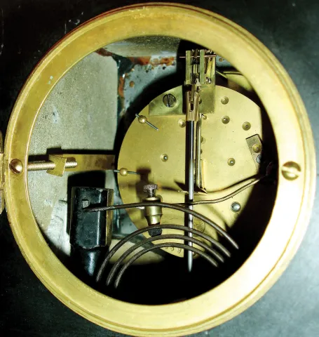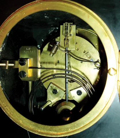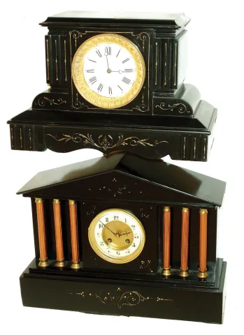 Clocks- 2 (Two) French black marble 8 days, time and strike, mantel clocks: flat top with Etienne Maxant movement with hidden front pull-out winders; 6-column architectural case with A.D. Mougin movement; c1890 the black cases, with their incised gold accents, are in very good condition except for some minor edge chips and one repaired top corner on the flat top. The larger case has had more recent blacking, dial center gold, new plywood bottom board, and column restoration. Both porcelain dials, and their beveled glasses, are fine. Hts 12 1/2" and 10"