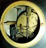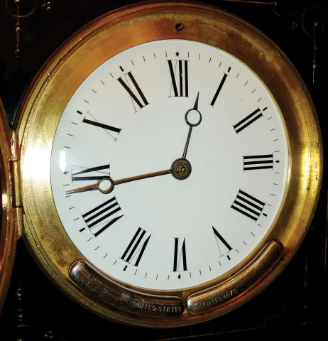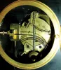 the black cases, with their incised gold accents, are in very good condition except for some minor edge chips and one repaired top corner on the flat top. The larger case has had more recent blacking, dial center gold, new plywood bottom board, and column restoration. Both porcelain dials, and their beveled glasses, are fine. Hts 12 1/2" and 10"