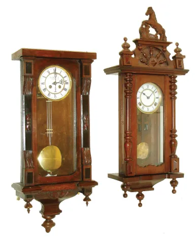 One front door glass is absent. Three are complete with dials, hands and pendulums and bottom finials; two are missing crests; one old German has a di...