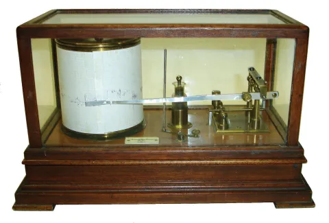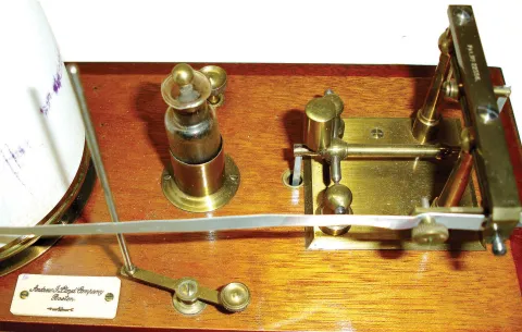 Barograph, London, England, for "Andrew J. Lloyd Co., Boston", mahogany and glass case, 8 day movement with cylinder escapement platform, c1910