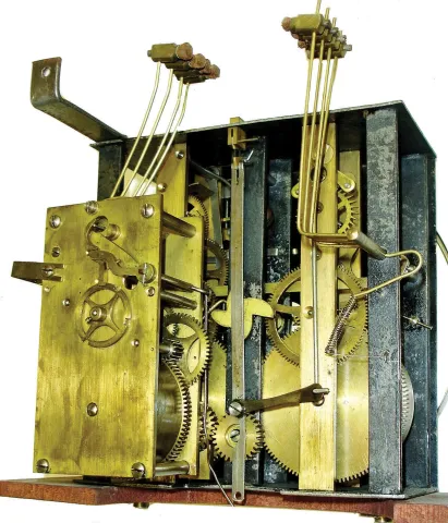 case with fading and scratches, mounts good, dial with minor dirt, movement with power to all trains, ticking, striking and chiming, but not reliably or correctly, will need service, Ht 34"