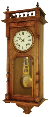 France, walnut cased wall clock, with Morbier iron framed repeating movement, the case top trimmed with a balustrade and glass in the door revealing unique grid iron pendulum, striking the hours on a straight wire gong, and repeating the hour strike 2 minutes later. C.1910 The case has lost all of its finish, however is in good condition and ready for final finishing. Dial is clean and good; hands original. ticks robustly and strikes reliably. Bottom finials are missing. Ht 39"