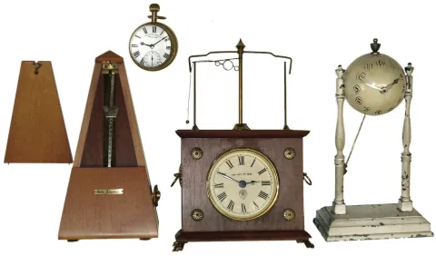 Clocks- 3 (Three) and Seth Thomas metronome: Globe Clock Co. "Worlds Fair" clock, ca 1941; Horolovar reproduction 8 day flying-ball Ignatz; "West End Watch Co." glass ball paperweight clock; 20th century