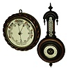 Barometers- 2 (Two) aneroid in carved walnut hanging cases; one signed Sidric, the other "F Rachmuhl Sohn, Basel." both are in very nice condition, with good clean dials. The Swiss one includes a two-scale mercury intact thermometer. Neither was tested. The Basel ht is 18", the round is 10" diameter