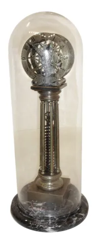 the brass has an older looking patina, and the brass dial is signed at the bottom. The movement, with deadbeat escapement that ticks okay, is powered by the extended spiral spring below. The veined marble round base and tall glass dome are fine. Ht to top of dome 24"