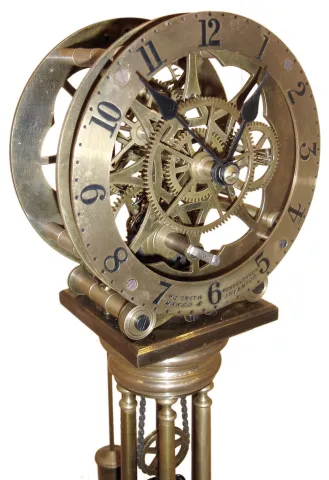 China spuriously signed "Smith, Musselburch", reproduction 8 day spiral-spring skeleton clock on marble base under glass dome, late 20th century the brass has an older looking patina, and the brass dial is signed at the bottom. The movement, with deadbeat escapement that ticks okay, is powered by the extended spiral spring below. The veined marble round base and tall glass dome are fine. Ht to top of dome 24"