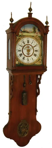 Staartklok, Dutch weight driven 30 hours, time, strike & alarm hanging clock, often called a "tail" clock or Dutch Hood, C.1810. the refinished case is in very nice condition as is the multicolor painted dial. The movement, with count wheel striking and alarm, appears complete with the continuous chain, lead weight and long pendulum. All three glasses in the hood are present but newer. Overall height 54"