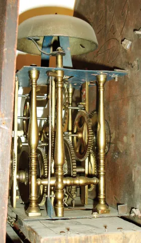 Staartklok, Dutch weight driven 30 hours, time, strike & alarm hanging clock, often called a "tail" clock or Dutch Hood, C.1810.