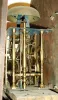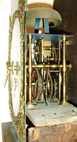the refinished case is in very nice condition as is the multicolor painted dial. The movement, with count wheel striking and alarm, appears complete with the continuous chain, lead weight and long pendulum. All three glasses in the hood are present but newer. Overall height 54"