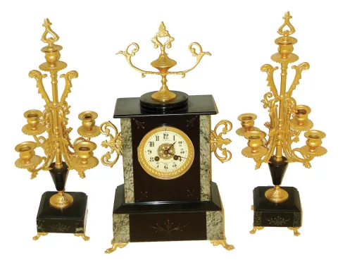 French black marble and gilt bronze 8 days, time and strike, mantel clock and pair of candelabra c1890 except for some minor edge chips, this set is in very nice condition with newly gilded cast bronze components. The clock's cream porcelain dial shows the name and address of a Paris retailer. The beveled glass is fine. The movement has the 1889 Marti stamp, count wheel and bell striking, but the pendulum is absent. Ht to top of candelabras 18 3/4"