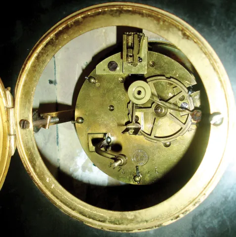 except for some minor edge chips, this set is in very nice condition with newly gilded cast bronze components. The clock's cream porcelain dial shows the name and address of a Paris retailer. The beveled glass is fine. The movement has the 1889 Marti stamp, count wheel and bell striking, but the pendulum is absent. Ht to top of candelabras 18 3/4"