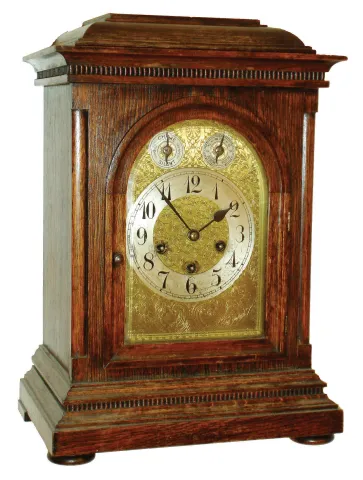 Junghans, Germany, oak 8 day Westminster-chime bracket clock, 5 gong rods, c1910 the case retains a smooth polished finish with no losses or damage, and the thick beveled glass is fine. The silvered chapter rings shows some tarnish but the engraved brass is still glossy. The "B11" 3-train movement ticks and chimes but not tested long term Ht 16 3/4"