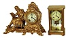 Clocks- 2 (Two) 8 days, time and strike, mantel clocks: Ansonia "Racine" cast metal figural; French brass and beveled glass crystal regulator with Marti movement; c1900