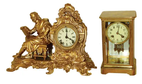 Clocks- 2 (Two) 8 days, time and strike, mantel clocks: Ansonia "Racine" cast metal figural; French brass and beveled glass crystal regulator with Marti movement; c1900 the "Racine" has a brightly restored finish but no losses or damage. Its porcelain dial and beveled glass are fine. The crystal regulator's porcelain dial is pristine and its glasses are good except for a top corner chip on the front door. Its compensating pendulum is fine, but the slow/fast adjusting arbor is detached and now packaged with the pendulum. Both signed movements tick and strike but were not tested long term Hts 11 1/4" and 9"