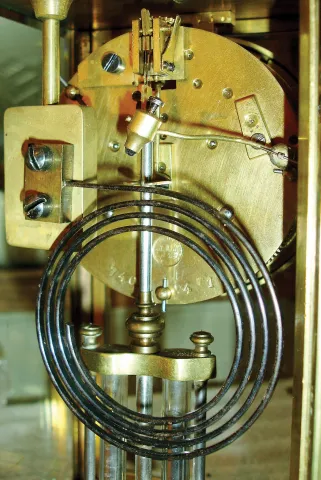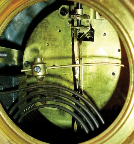 the "Racine" has a brightly restored finish but no losses or damage. Its porcelain dial and beveled glass are fine. The crystal regulator's porcelain dial is pristine and its glasses are good except for a top corner chip on the front door. Its compensating pendulum is fine, but the slow/fast adjusting arbor is detached and now packaged with the pendulum. Both signed movements tick and strike but were not tested long term Hts 11 1/4" and 9"