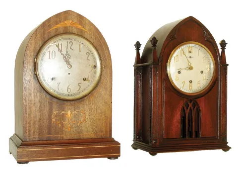 Clocks- 2 (Two) Conn., chime: (1) New Haven Clock Co., New Haven, Conn., "Abbey", 8 day time, strike & Westminster chime on rods, c1929. (2) Seth Thomas Clock Co., Thomaston, Conn., "Chime Clock No. 64", 8 days, time & Westminster chime on rods, c1914.