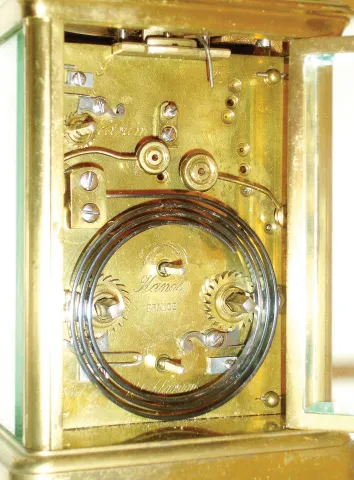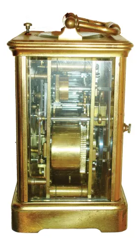 France, 8 days, time, strike & repeating on demand platform escapement carriage clock with alarm, polished Cornice case with beveled glass panels, Roman numeral white enamel dial signed by retailer "The George H. Ford Co. New Haven", Arabic numeral alarm dial below, the dials with gilt mask, blued steel hands, c1910 Case with spotting, abrasions, and discoloration, front, left, and rear glasses with chips, dials and hands good, gilt mask a bit dirty, ticks and strikes, but very oily, needs service, alarm functional, hands need to be synchronized with striking, hour snail advancing at half hour, Ht 7" to top of handle