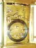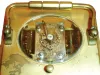 Case with spotting, abrasions, and discoloration, front, left, and rear glasses with chips, dials and hands good, gilt mask a bit dirty, ticks and strikes, but very oily, needs service, alarm functional, hands need to be synchronized with striking, hour snail advancing at half hour, Ht 7" to top of handle