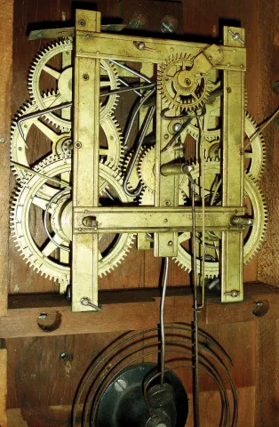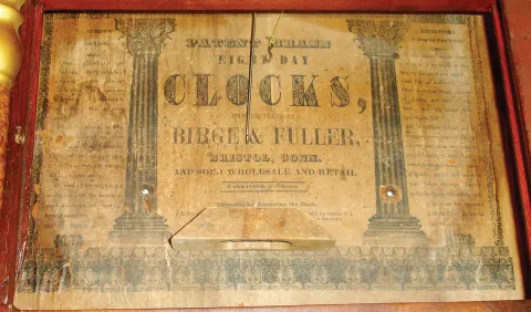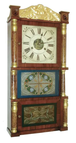 Birge & Fuller, Bristol, Conn., 8 days, time and strike, weight-drive brass strap brass movement triple-decker shelf clock, c1845 Refinished mahogany veneered case in very nice condition with a small chip on the base. There are some small chips where the columns are nailed to the case. The gilt areas on the columns have an old layer of gold paint. Both tablets are original and probably by Fenn. Original painted dial is very nice with small loss a the mounting pins. Hands are original. The case probably had feet that are now missing. Nice label inside the case. Movement is signed. Ht 33 1/2"