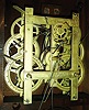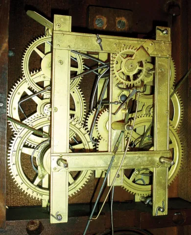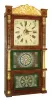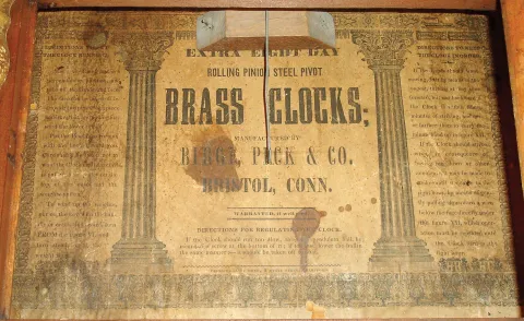 Birge, Peck & Co., Bristol, Conn., 8 days, time and strike weight driven triple-decker shelf clock with late strap brass movement, c1850 Mahogany veneered case has lost its original finish with veneer loss and small chips scattered on the front of the case. Original painted metal dial has some loss at the mounting pins and at the upper right corner. Both Fenn tablets are original with scattered loss in the frosted areas. Hands are original. Columns have scattered spots to the finish and some wear to the gilt areas. Top splat has been gold painted. Clock probably had turned feet that are now missing. Ht 33 1/4"