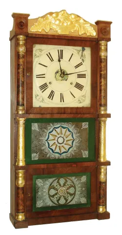Mahogany veneered case has lost its original finish with veneer loss and small chips scattered on the front of the case. Original painted metal dial has some loss at the mounting pins and at the upper right corner. Both Fenn tablets are original with scattered loss in the frosted areas. Hands are original. Columns have scattered spots to the finish and some wear to the gilt areas. Top splat has been gold painted. Clock probably had turned feet that are now missing. Ht 33 1/4"