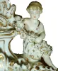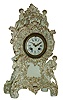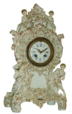 Lenzkirch, Germany, porcelain 8 days, time and strike, mantel clock, movement #723527, c1882 this highly ornate and fragile case is okay except for a missing hand on the top right figure. The porcelain dial, with blue numbers, is fine, and so is the beveled glass. The rear glass is cracked but still in place. The signed movement is missing its pendulum, and will need service. Ht 17 1/4"