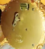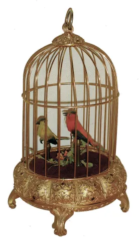Elpa, West Germany, two singing whistling birds in brass cage, c1975 the ornate cage even has inset imitation rubies around the cast metal base. The feathered birds tweet briskly and move their beaks and tails. On the bottom is the winder and switch for "continuous, intermission, stop". Ht 10 1/2"