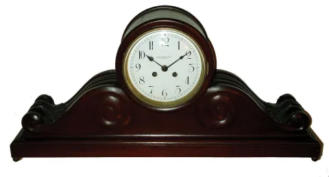French 8 days, time and strike, mahogany tambour mantel clock, sold by Black, Starr & Frost, New York, with Vincenti and H&H movement, c1890 the large carved ornate case retains an old dull finish which should polish nicely, and there are no losses or damage. The white signed enamel dial and convex beveled glass are fine. The minute hand is newer and too short. The movement ticks and strikes. Ht 12 1/2"