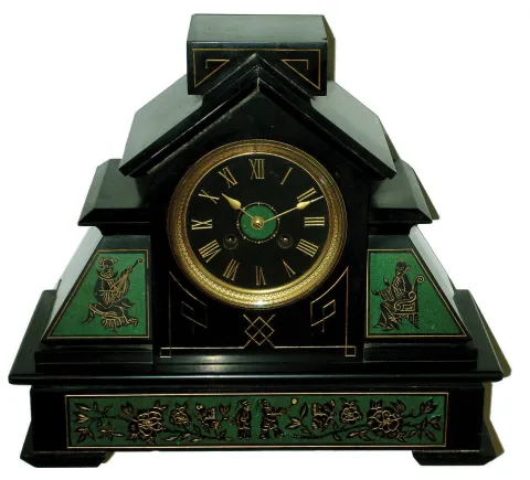 with its bold green decorative panels -- showing Asian figures -- and marble dial, this heavy architectural case is in very nice condition with just one chip off a back corner and a few much smaller edge chips. The movement is correctly stamped. The front and back beveled glasses are fine. Ht 12 1/4"