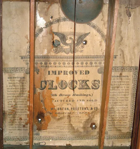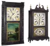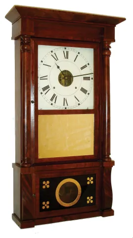 Clocks- 3 (Three): (1) Bench-made pillar & scroll with antique 30 hours, time and strike, wood movement; (2) Williams, Orten & Prestons & Co., Farmington, Conn., 30 hours, time and strike, wood movement with carved columns and plain splat case, c1837; (3)