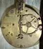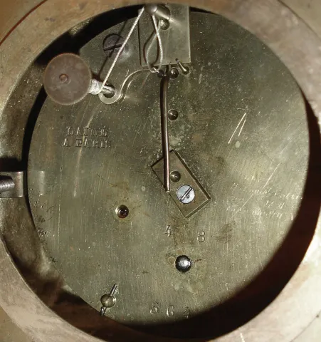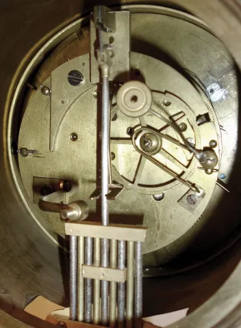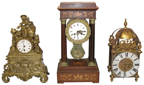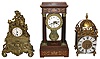 Portico clock ticks and strikes, case with minor losses, dial with chips and hairlines, figural clock with dirt, abrasion, and losses, dial with repaired chip and hairlines, movement ticks, crutch fork broken, lantern clock ticks, strike train runs, but is not activating hammer, pendulum missing, case with dirt and tarnish