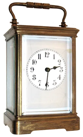 Boston Clock Co., Boston, Mass., 8 days, time and hour/ half hour strike tandem-wind carriage clock, c1890, serial #D218 Tarnished brass case in need of polishing. Original porcelain dial has hairline cracks. Hands are original. Movement is signed on the back plate Beveled glass panels are perfect. Unusual design with the balance platform mounted vertically on the back plate Ht 7 1/4"