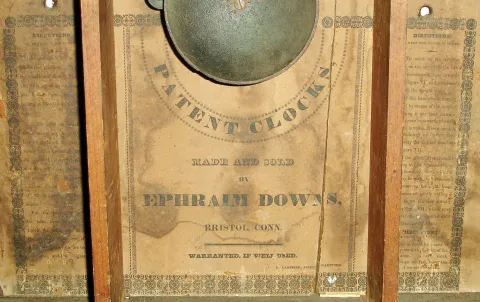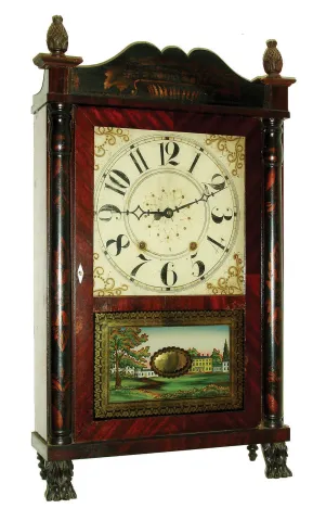 Ephraim Downs, Bristol, Conn., 30-hour, time and strike, weight driven wood movement stenciled half column & splat shelf clock with carved paw feet and pineapple finials. c1830 Mahogany veneered case with original finish and original stencils under a dark finish. The chimneys have been repaired where they join the splat. Painted dial with minor wear has its wood stretchers removed. Tablet by Moberg is a replacement. Period hands. Original feet and pineapple finials. Movement is not original to this case as it is for a long pendulum case. Decent label. Ht 28 1/2"