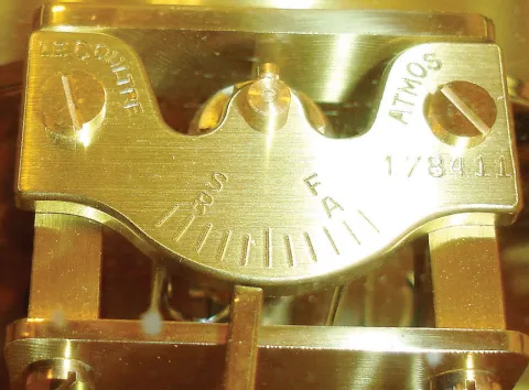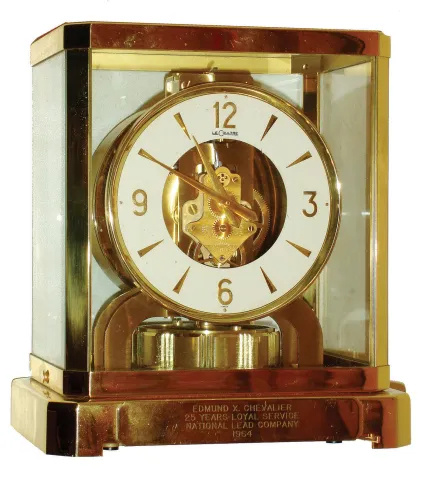 Jaeger - LeCoultre "Atmos" Swiss perpetual running clock powered by changes in temperature and atmospheric pressure, 15 jewels, serial number 178411, presentation plate dated 1964